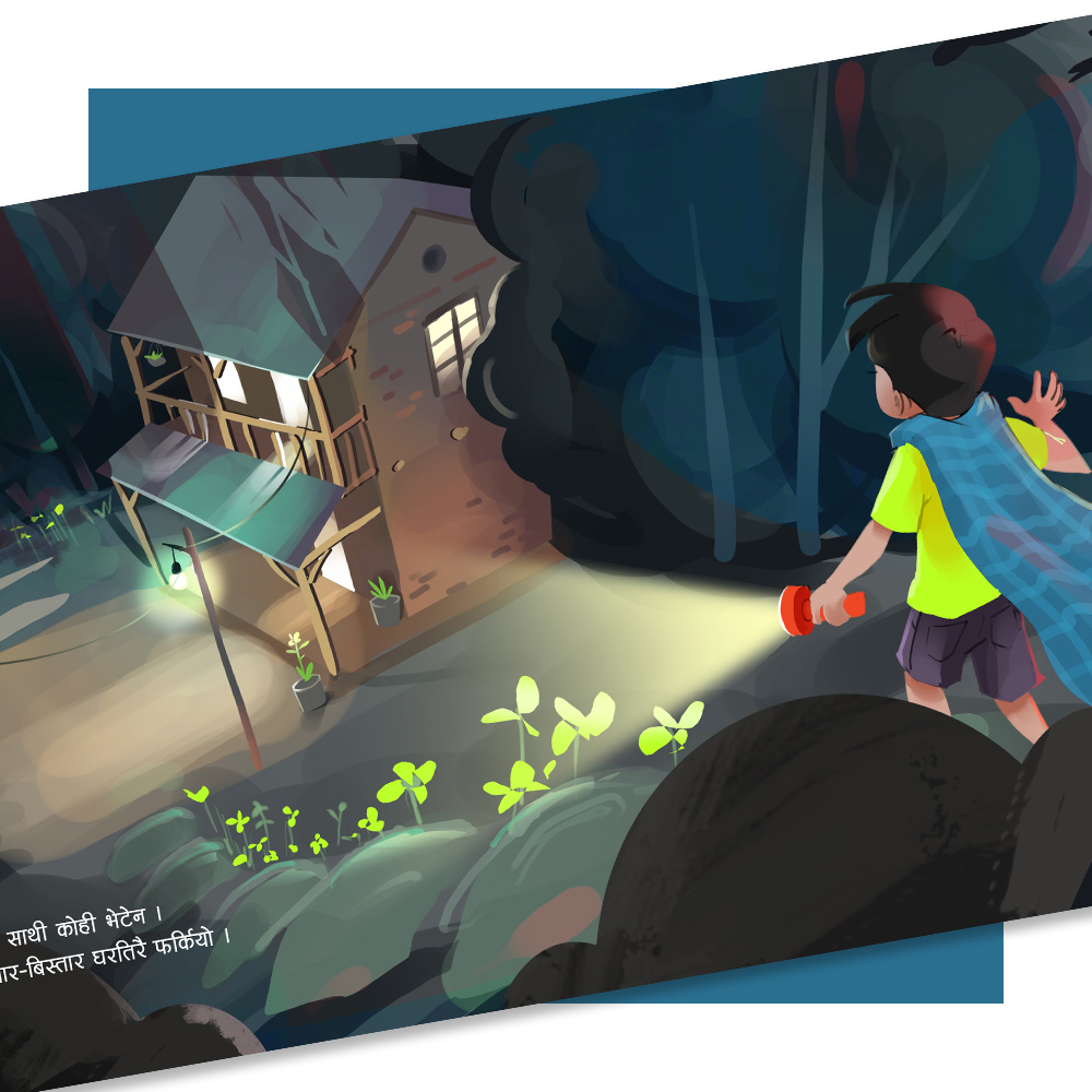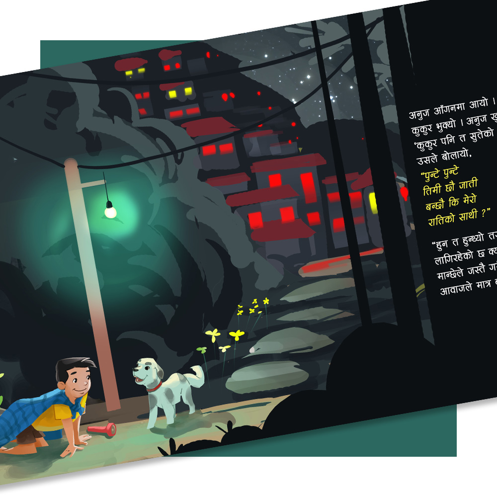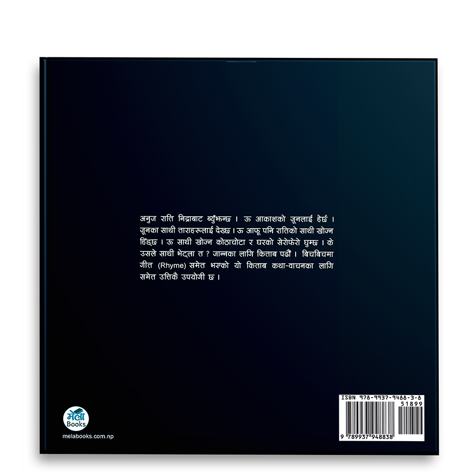अनुज राति निद्राबाट ब्युँझन्छ । ऊ आकाशको जूनलाई हेर्छ । जूनका साथी ताराहरूलाई देख्छ । ऊ आफू पनि रातिको साथी खोज्न हिॅड्छ । ऊ साथी खोज्न कोठाचोटा र घरको सेरोफेरो घुम्छ । के उसले साथी भेट्ला त ? जान्नका लागि किताब पढौँ । बिचबिचमा गीत (Rhyme) समेत भएको यो किताब कथा-वाचनका लागि समेत उत्तिकै उपयोगी छ ।